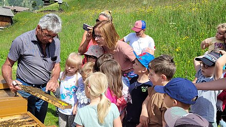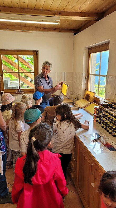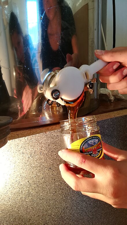 In addition to the small mountain farm and the rental business, we also run a beekeeping business with our own queen rearing. Together with our two daughters, Manuela and Theresa, we manage around 150 bee colonies. These produce an extremely tasty and high-quality honey from the nectar of mainly dandelion, blueberry, forest, raspberry, alpine rose and the diverse flowering mountain meadows. Our honey is therefore a mixture of different flowers and herbs.