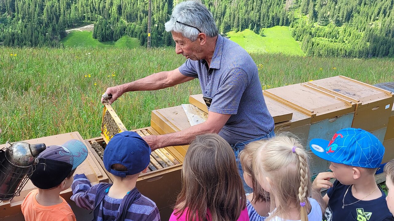 Wir können bei unseren sanftmütigen Bienen immer ohne Schutzkleidung arbeiten, auch die Kinder.
